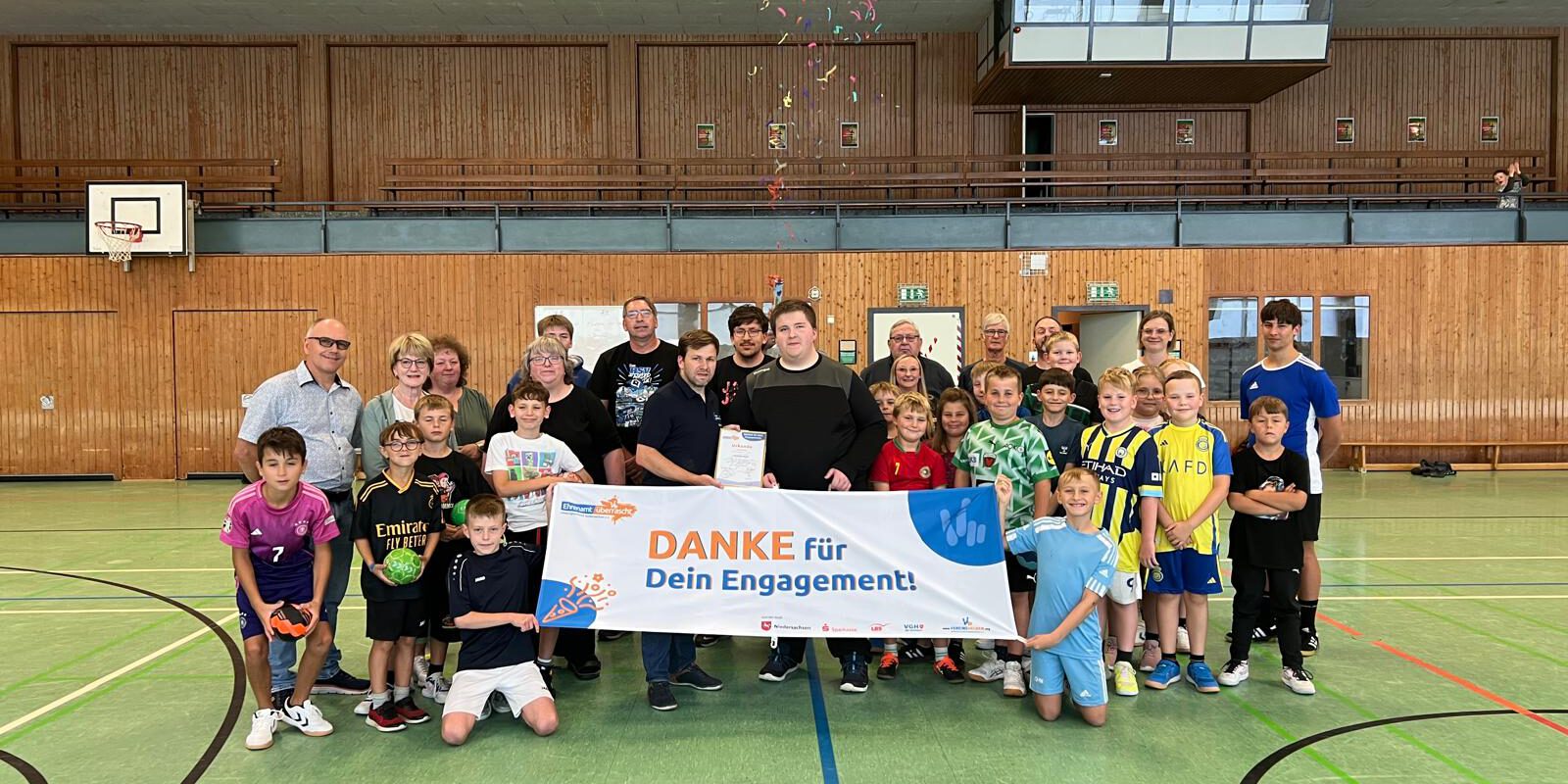 Die Ehrung fand natürlich während des Trainings der männlichen E-Jugend in der Burgberghalle Katlenburg statt. John und Mattis marschierten mit dem „Ehrenamt überrascht“-Banner vorneweg in die Sporthalle und Stefan Zöll, stellvertretender Vorsitzender der Sportjugend Northeim-Einbeck, nahm die Auszeichnung vor und überreichte dem sichtlich überraschten Freddy eine Urkunde und eine Tasche mit Geschenken.