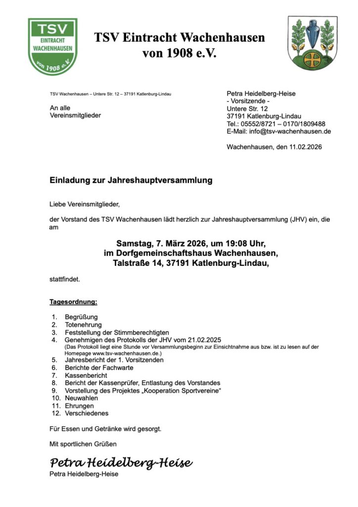 Am 7. März 2026 findet die Jahreshauptversammlung des TSV Wachenhausen satt. Die Versammlung startet um 19:08 Uhr im DGH Wachenhausen. Alle Mitglieder sind herzlich eingeladen!